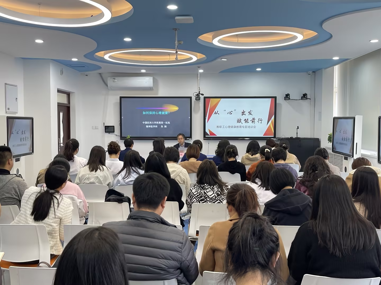 为缓解广大教职工工作压力,提高教师心理健康素质,营造更加和谐愉快的教育环境,11月2日,学院邀请中国医科大学附属第一医院精神医学科朱刚教授来院做题为《如何保持心理健康》专题讲座,为全校教师送上“舒心大礼包”,提升职业幸福感。培训以线上线下相结合的方式进行,本溪、沈阳两个校区近100余名教职工参与了培训。