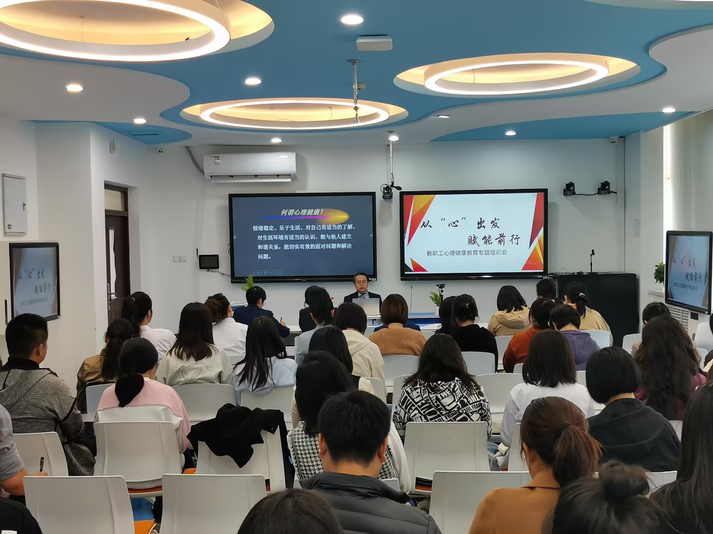 朱刚教授通过有趣的开场互动瞬间激发了老师们的学习热情;通过案例分析,帮助老师们理解为什么会产生压力、如何理解压力、正确应对压力;对教师这个群体如何保持心理健康和自我关怀,给出了专业建议。