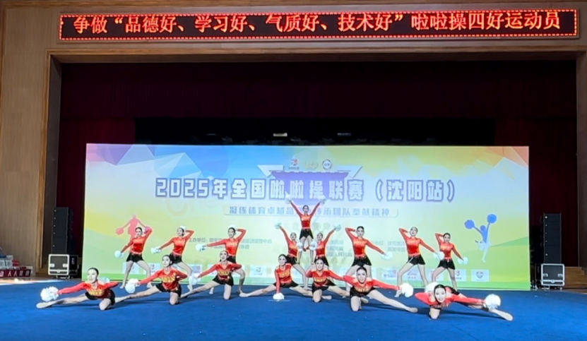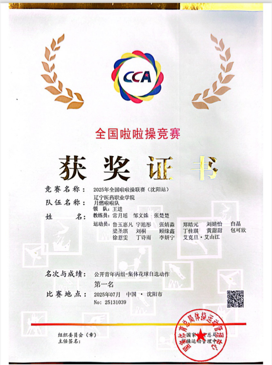 7月4日至6日,2025年全国啦啦操联赛(沈阳站)在沈阳城市学院举行。辽宁医药职业学院月燃啦啦操队在公开青年丙组-集体花球自选动作项目中勇夺第一名,再度站上最高领奖台。