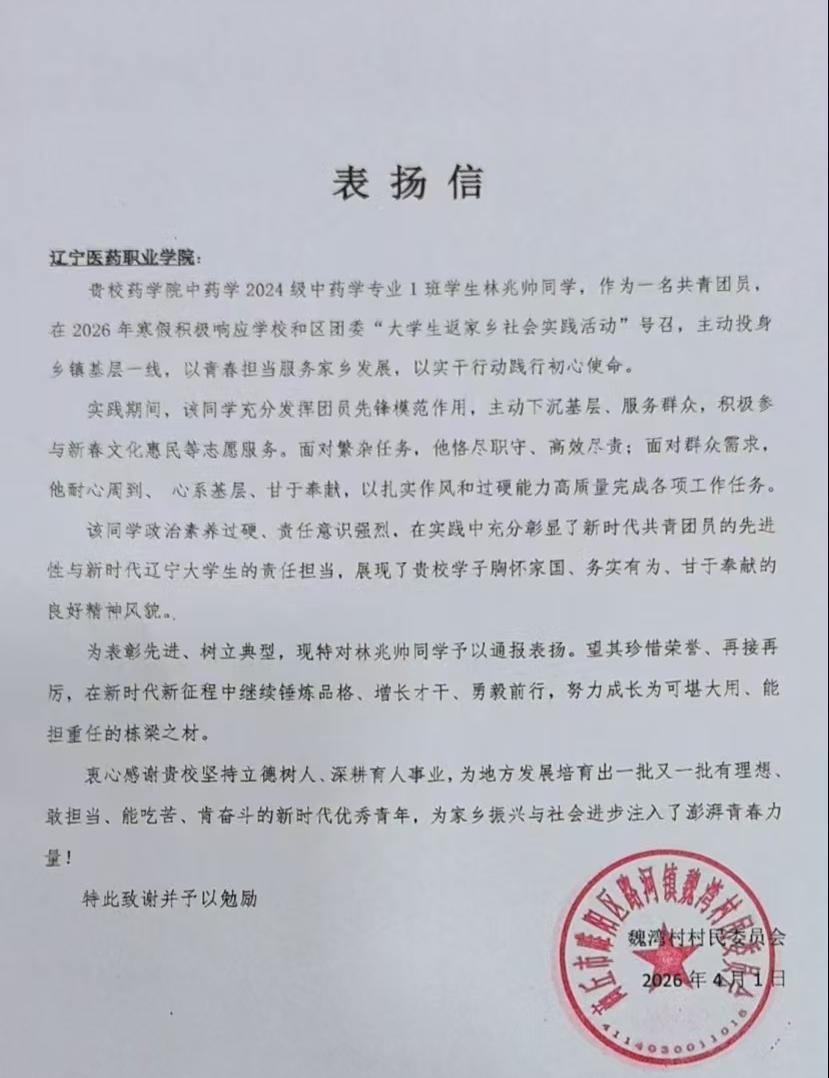 林兆帅坚持知行合一,积极响应“返家乡”社会实践号召,参与乡村环境整治、文明过节宣传及春节系列文明实践活动,圆满完成各项任务并获荣誉证书。商丘市睢阳区路河镇魏湾村居民委员会致信称赞,他展现出主动担当、无私奉献的新时代大学生良好风貌。
