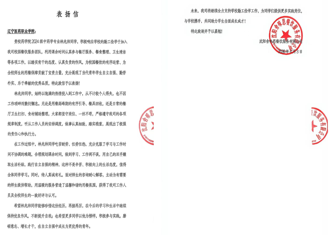 近日,我校陆续收到来自基层单位与公益服务组织的多封表扬信,对药学院2024级中药学1班学生林兆帅在勤学笃行、社会实践、应急救援等方面的优异表现给予高度评价,对学校落实立德树人根本任务、培育担当奉献型青年人才的育人成果表示诚挚感谢。