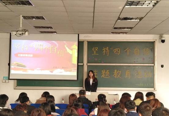 11月11日,焦玟心同学以“坚持‘四个自信’”为主题开展宣讲,号召青年学生作为社会发展的中坚力量,要坚持“四个自信”,不断提升自身素质修养,用习近平新时代中国特色社会主义思想武装头脑。