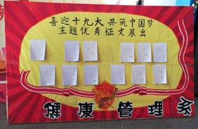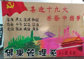 10月中下旬,健康管理系开展以“喜迎十九大 共筑中国梦”为主题的系列文化活动,以文艺汇演、宣传展板、征文随笔、主题演讲等形式大力营造良好文化氛围,唱响主旋律,弘扬正能量,庆祝党的十九大胜利召开,在全系范围内形成喜迎十九大、永远跟党走的浓厚氛围。