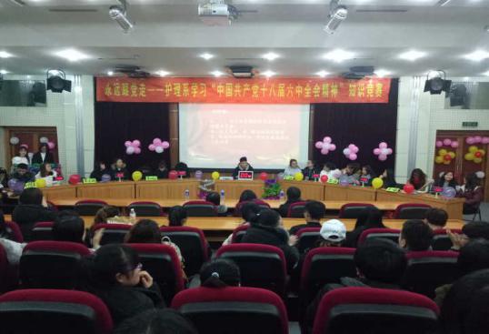 为深入学习贯彻十八届六中全会精神,营造浓厚学习氛围,护理系党总支创新学习形式,于12月23日在学术报告厅举办“永远跟党走——学习十八届六中全会精神”知识竞赛,以赛促学,以学促做。该系党总支王丹副书记,辅导员孙圣钧、周利老师出席比赛。