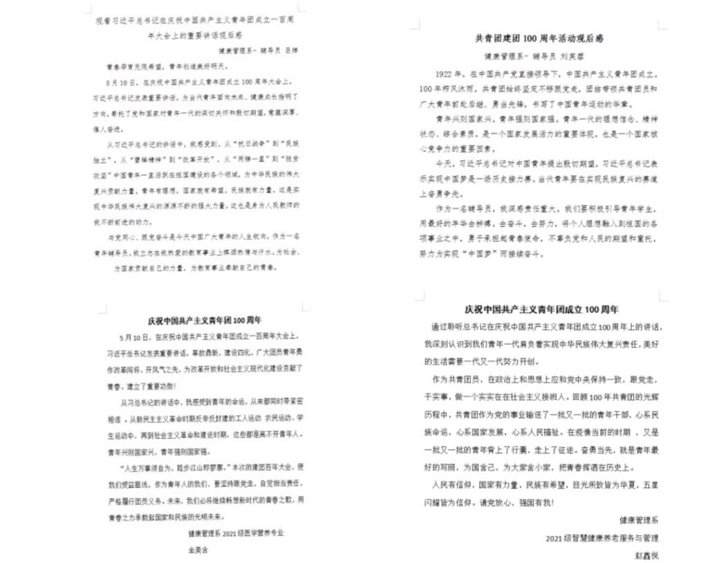 为庆祝中国共产主义青年团成立100周年,引领青年学子坚定信念,听党话、跟党走,守正创新、踔厉奋发,5月10-29日,健康管理系以“理论认知——思想认识——实践养成”为活动设计思路,在线上举办建团百年系列活动。全系师生积极参与。