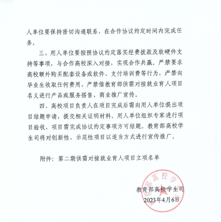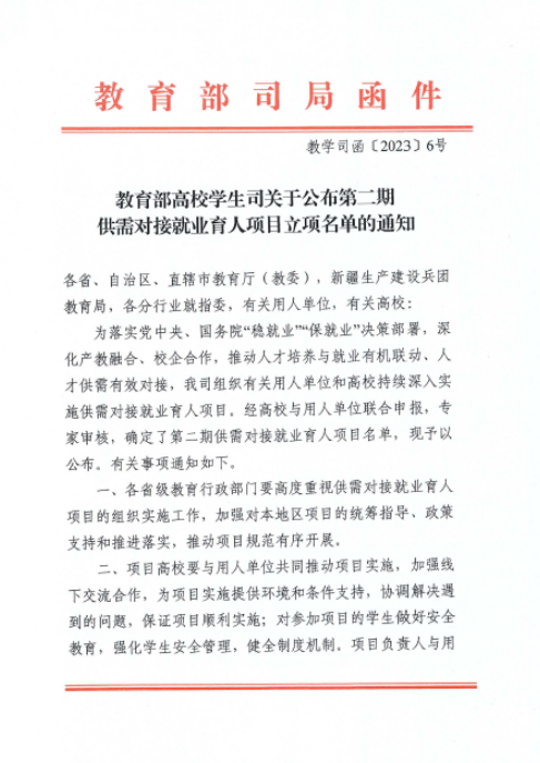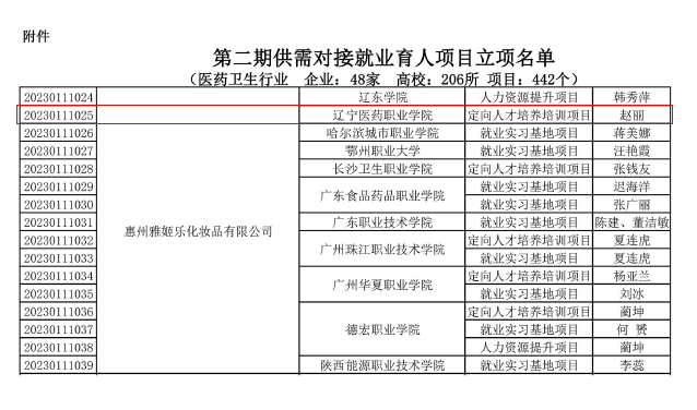 2023年4月6日,教育部高校学生司公布了第二期供需对接就业育人项目立项名单,医学技术系医学美容技术专业联合惠州雅姬乐化妆品公司申报的“定向人才培养培训项目”获得立项。