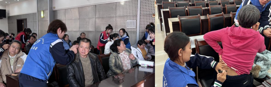 随后,专业服务与文艺表演同步开展。同学们现场按摩并讲解脊柱穴位知识,同步科普糖尿病预防管理;科普后,共唱《大中国》,以歌声传递生活热爱与家国情怀。