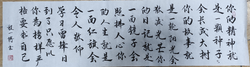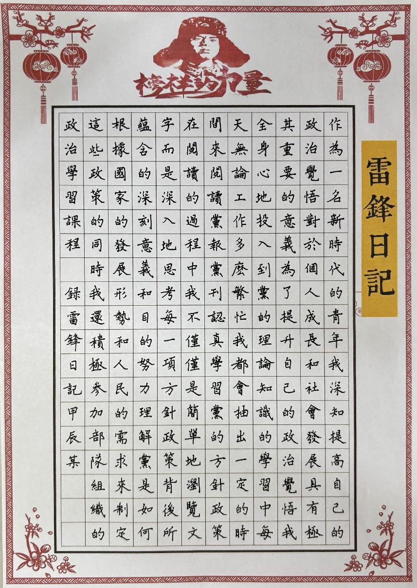 在比赛中,同学们怀着崇敬的心情,重写《雷锋日记》经典片段和《金城龙笔记》中的感人语录。同学们挥毫泼墨,将对英雄的敬仰之情融入笔端。一幅幅作品或苍劲有力,或隽永飘逸,不仅展现了同学们扎实的书法功底,更体现了他们对雷锋精神和金城龙精神的深刻理解与传承决心。通过书写,同学们在字里行间重温英雄初心,感悟新时代青年的责任与担当。