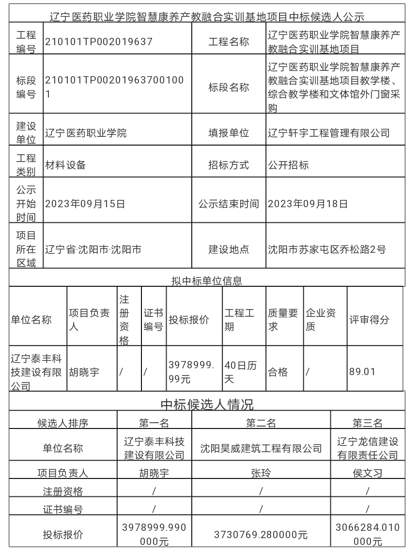 辽宁医药职业学院智慧康养产教融合实训基地项目教学楼、综合教学楼和文体馆外门窗采购中标候选人公示