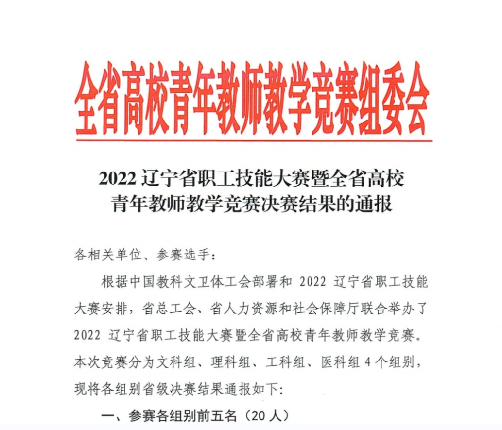 2022年12月12日-13日,辽宁省总工会、辽宁省人力资源和社会保障厅联合举办了2022辽宁省职工技能大赛暨全省高校青年教师教学竞赛线上决赛。我院青年教师王莉楠获医科组第五名。