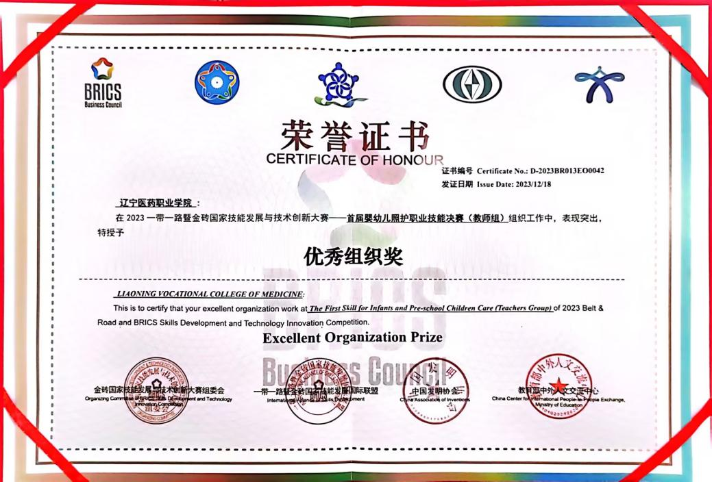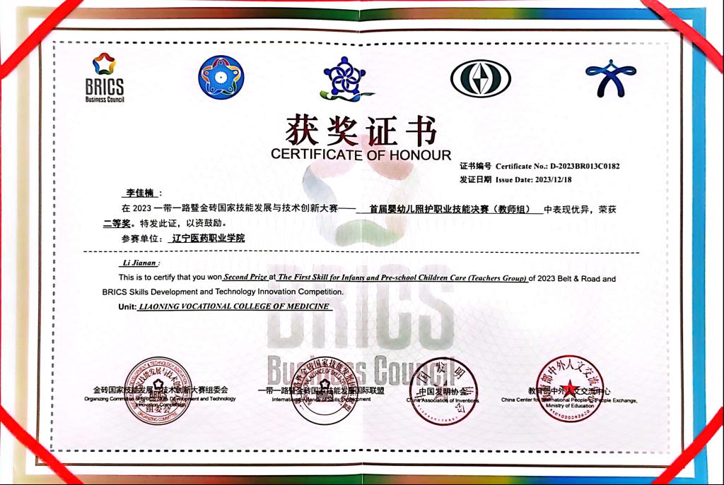 2023年12月15日-18日,2023“一带一路”暨金砖国家技能发展与技术创新大赛之首届婴幼儿照护职业技能全国总决赛在湖南岳阳职业技术学院举行。本次赛事得到了社会各界的广泛关注,各院校积极参与,来自全国392支中职组队伍、484支高校组队伍、452支教师组队伍报名参赛,通过11场区域选拔赛的开展,其中75支教师队伍入围总决赛,辽宁医药职业学院护理系李佳楠获得教师组总决赛二等奖,辽宁医药职业学院获得优秀组织奖。