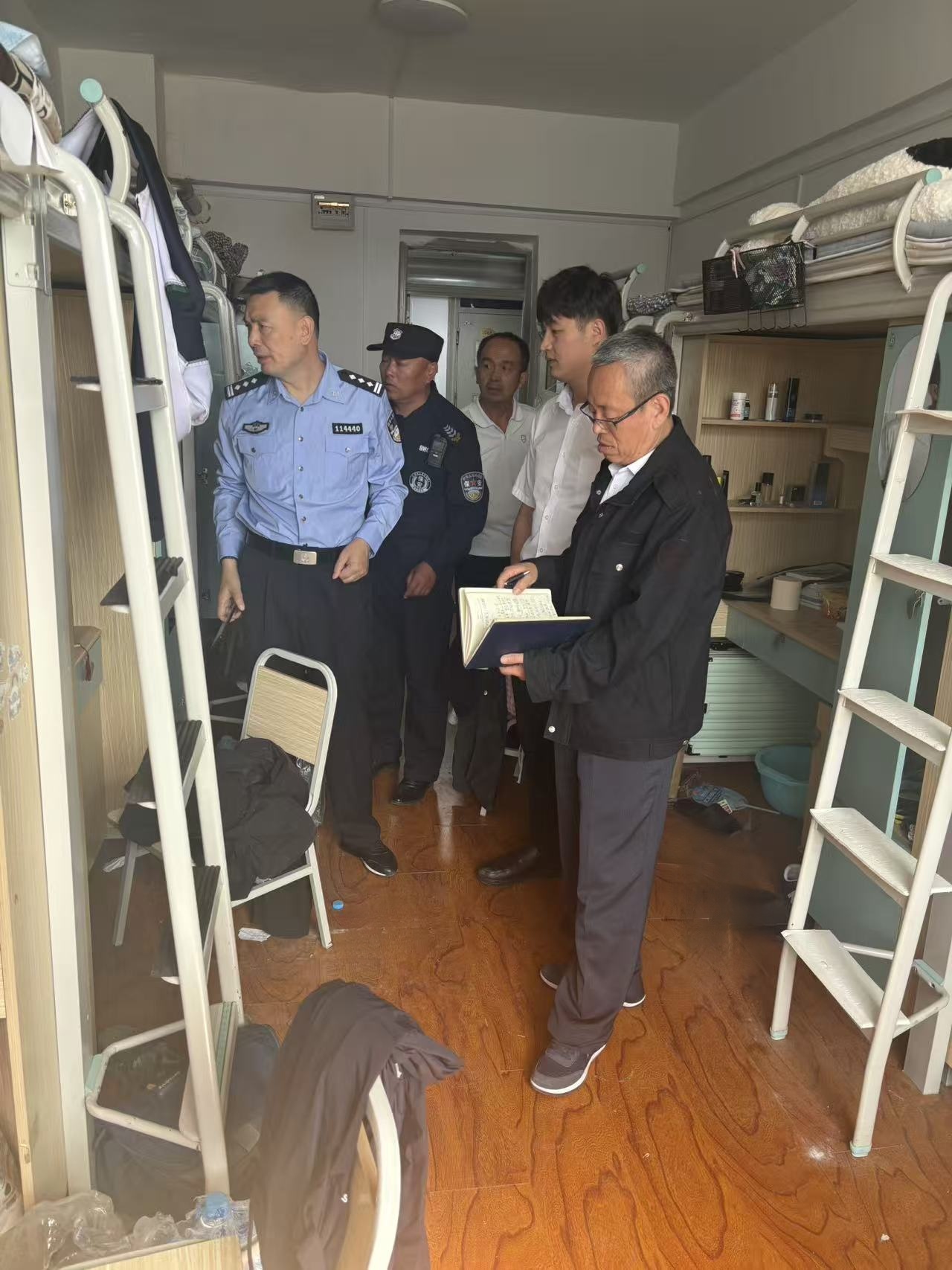在寝室检查过程中,老师们和驻校民警现场开展普法教育,向大学生明确告知携带管制刀具的法律后果,倡导互相关爱、拒绝欺凌、不使用大功率电器等,号召学生担起校园安全使命,及时发现、上报和排除身边校园安全风险隐患。