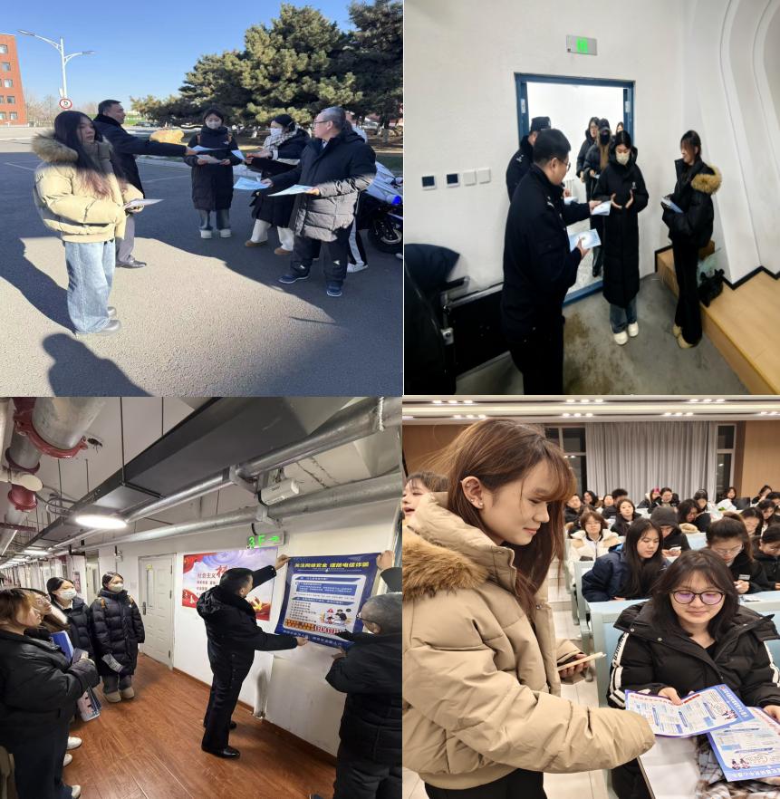 在人流密集的主干道悬挂醒目的宣传横幅、学生宿舍显著位置张贴宣传海报;利用电子屏等多媒体设施在食堂等地循环播放防范电信网络诈骗安全知识;安全保卫部联合驻校民警组织学生志愿者在学校出入口、学生宿舍、教学区域发放防范电信网络诈骗宣传资料,向师生详细讲解了当前高发的网络刷单、虚假购物、冒充客服、网络贷款、冒充公检法等多种诈骗类型的作案手法和防范技巧,并向师生介绍属地公安部门报警电话,提醒大家牢记于心。