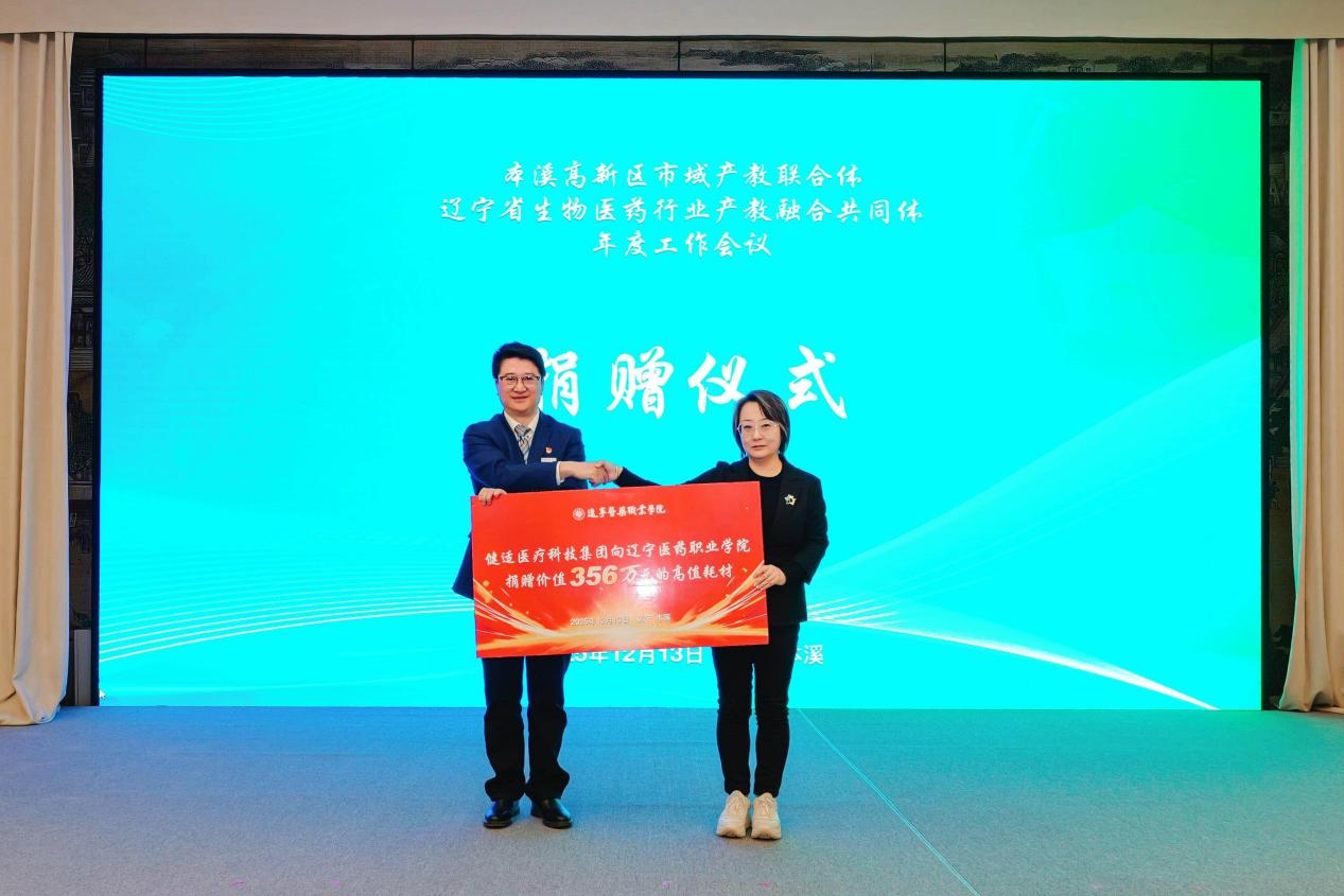 在签约仪式与捐赠仪式环节,学院与沈阳三生制药、上海医药集团北方药业等多家企业签订合作协议。健适医疗科技集团向学院捐赠了价值356万元的高值耗材,助力人才培养提质增效。
