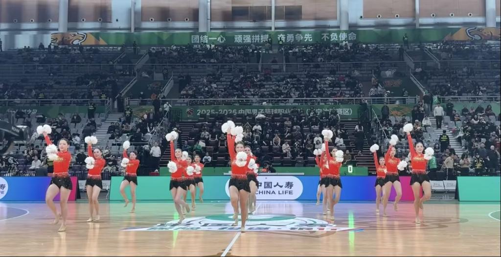 月燃啦啦操队曾获全国啦啦操锦标赛、辽宁省学生活力大赛等多项赛事冠军,专业实力受到广泛认可。队员们身着红色队服,伴随节拍完成整齐划一的动作,为这场比赛注入青春活力,成为赛场边一道亮眼风景线,体现了校园体育文化与职业体育赛事的精彩联动。