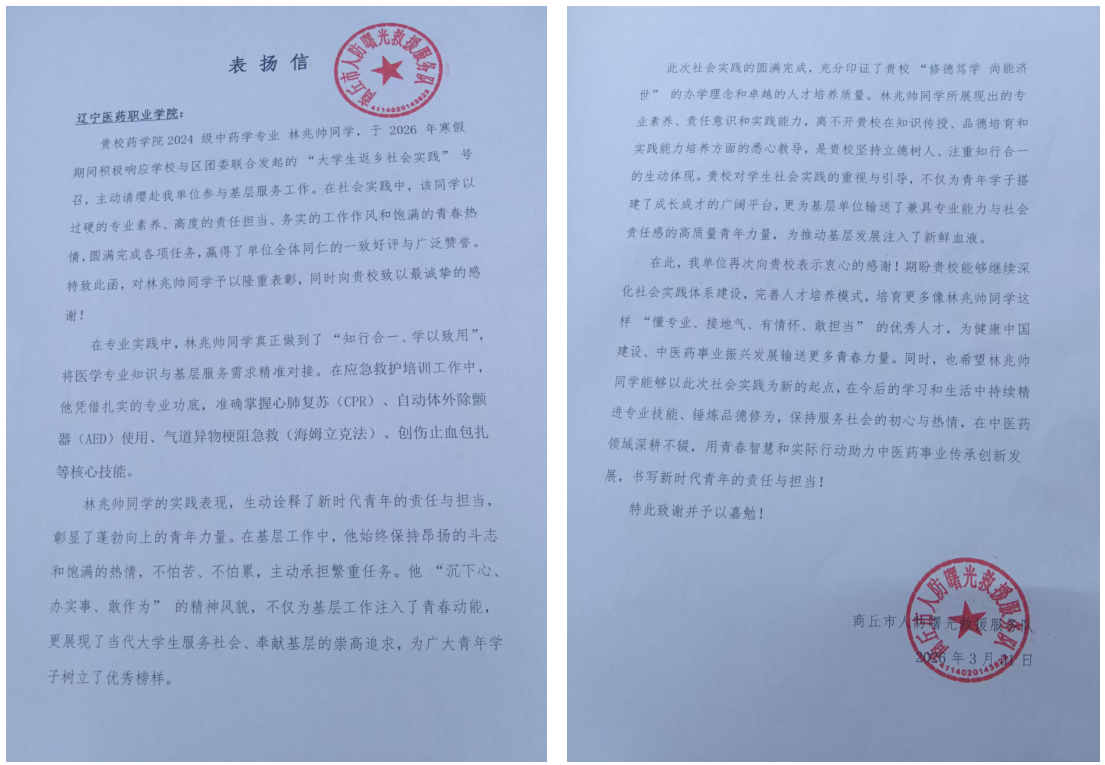 近日,我校陆续收到来自基层单位与公益服务组织的多封表扬信,对药学院2024级中药学1班学生林兆帅在勤学笃行、社会实践、应急救援等方面的优异表现给予高度评价,对学校落实立德树人根本任务、培育担当奉献型青年人才的育人成果表示诚挚感谢。