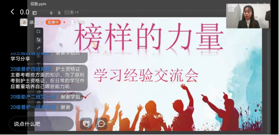 为营造期末浓郁的学习氛围,提升学生的学习热情和积极性,护理系于12月6日晚6时30分在钉钉学习交流群举办“榜样的力量”学习经验交流会,共1000名学生参与活动,拉开了护理系学风建设月活动的序幕。