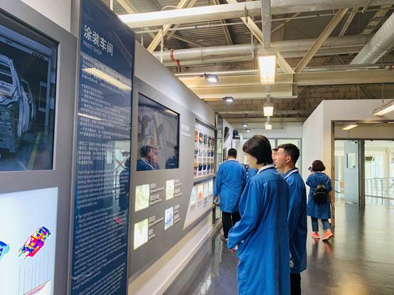 通过安检之后,党员们在解说员的引领下,分成两组,穿着印有宝马标识的蓝色游客专用服装,带着防护镜和耳麦,经过主办公区和就餐休闲区,步入工厂生产车间。党员们在指定的黄色区域内行进,在解说员的细致讲解下,先后参观了冲压、车身、涂装和总装车间。大家感受到的是整洁安静的工作环境和井然有序的工作节奏。