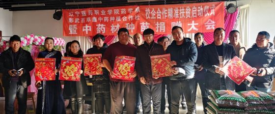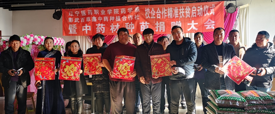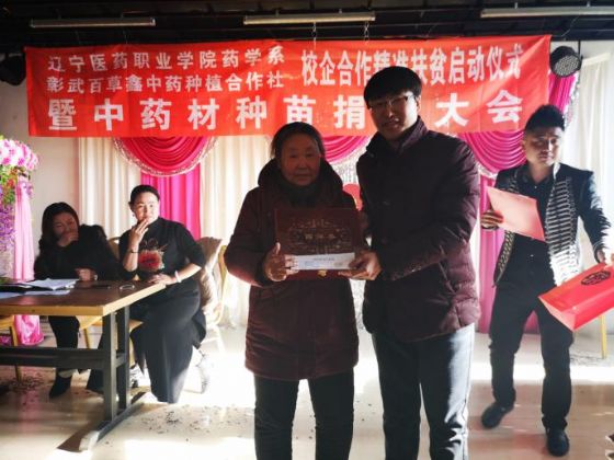 为进一步深化校企合作,推动校企共同服务社会,2018年12月31日,药学系与学生社会实践基地——百草鑫中药种植合作社在彰武县二道河子乡举办了“校企合作精准扶贫工作启动仪式——暨中药种苗捐赠大会”。此次捐赠大会共捐赠苦参种子60斤,播种面积可达120亩,同时百草鑫中药种植合作社将十万元种子抵用券,分别发到彰武县12户贫困的种植户手中。