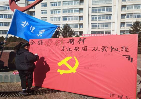 同日,护理系全体学生在校园腾飞广场举行了向雷锋学习的实践活动。学生会相关负责同学讲解了雷锋生平故事与雷锋精神的内涵,号召广大学生向雷锋学习,践行新时代雷锋精神。同学们依次在宣誓板上签名。随后,各个班级领取垃圾袋,开始清扫校园垃圾,在寒冷的天气里,学生们依然热情饱满,干劲十足。(文、图/柴月)