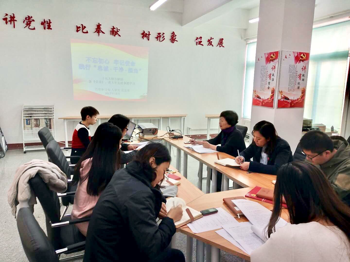 为学习贯彻十九大精神,按照学院理论学习要求,11月3日,监察审计处党支部、人事处党支部共同开展了以“不忘初心,牢记使命,践行忠诚·干净·担当”为主题的理论学习活动,解读十九大报告精神及对党章的修改,并学习了黄大年同志先进事迹。学院党委易晓冰副书记与支部党员一同参加学习。