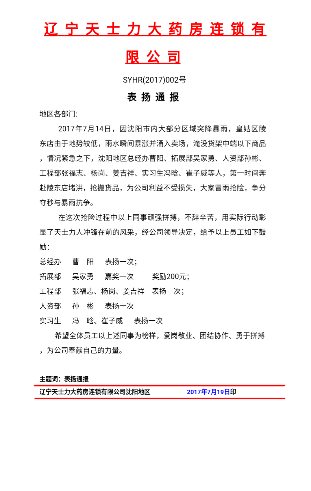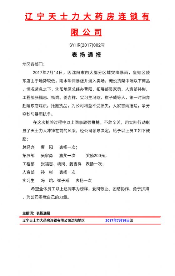 7月14日,沈阳市突降暴雨,多地受灾,我院药学系2015级医药营销专业学生冯晗、崔子威主动参加实习单位——辽宁天士力大药房连锁有限公司的抢险救援活动,第一时间奔赴该药房受灾严重的皇姑区陵东店奋力抢险,受到了实习单位的通报表扬。
