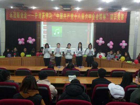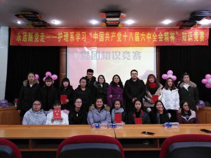 为深入学习贯彻十八届六中全会精神,营造浓厚学习氛围,护理系党总支创新学习形式,于12月23日在学术报告厅举办“永远跟党走——学习十八届六中全会精神”知识竞赛,以赛促学,以学促做。该系党总支王丹副书记,辅导员孙圣钧、周利老师出席比赛。