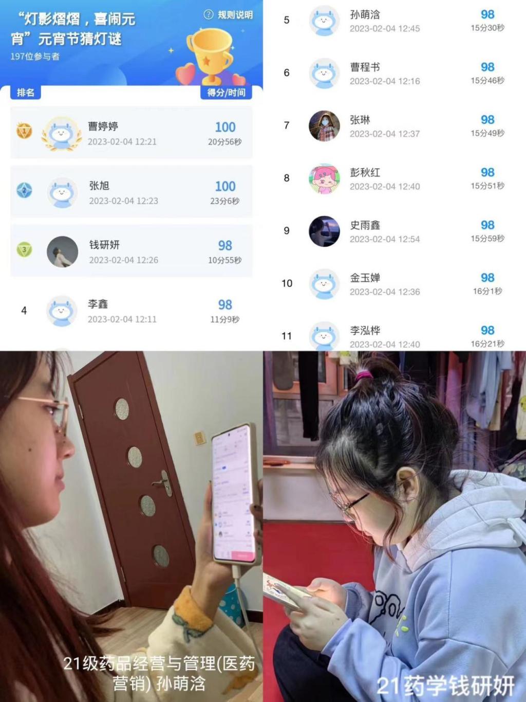 2月4日,药学系开展“灯影熠熠 喜闹元宵”元宵节猜灯谜活动。此次活动采取线上方式,五颜六色的彩灯谜条和喜气洋洋的灯笼,可谓是谜面妙趣横生,谜底包罗万象,涵盖了生活常识、党史知识、传统文化及成语谚语等方方面面,兼具知识性和趣味性。猜灯谜活动健心益智、喜闻乐见,同学们收获了知识与快乐。