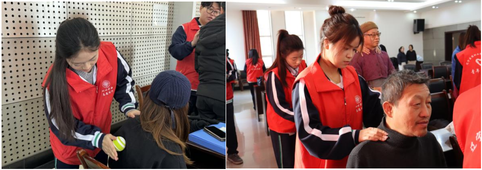 随后,专业服务与文艺表演同步开展。同学们现场按摩并讲解脊柱穴位知识,同步科普糖尿病预防管理;科普后,共唱《大中国》,以歌声传递生活热爱与家国情怀。