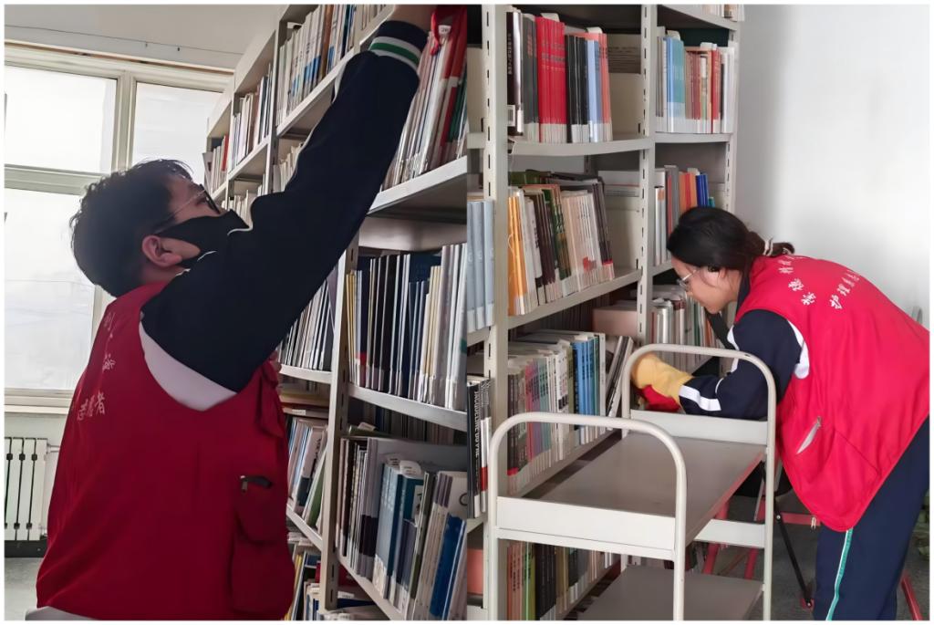 活动中,志愿者们分工协作、干劲十足,全面清扫图书馆公共区域,重点清理书架缝隙、窗台等角落的灰尘与杂物。大家认真擦拭每一层书架,耐心整理错位的书籍,将散落的报刊归位。志愿者们化身文明引导员,耐心提醒同学们保持安静、爱护书籍,用温馨的话语引导文明阅读风尚,营造了书香四溢、文明和谐的校园氛围,以点滴行动为校园建设贡献青春力量。
